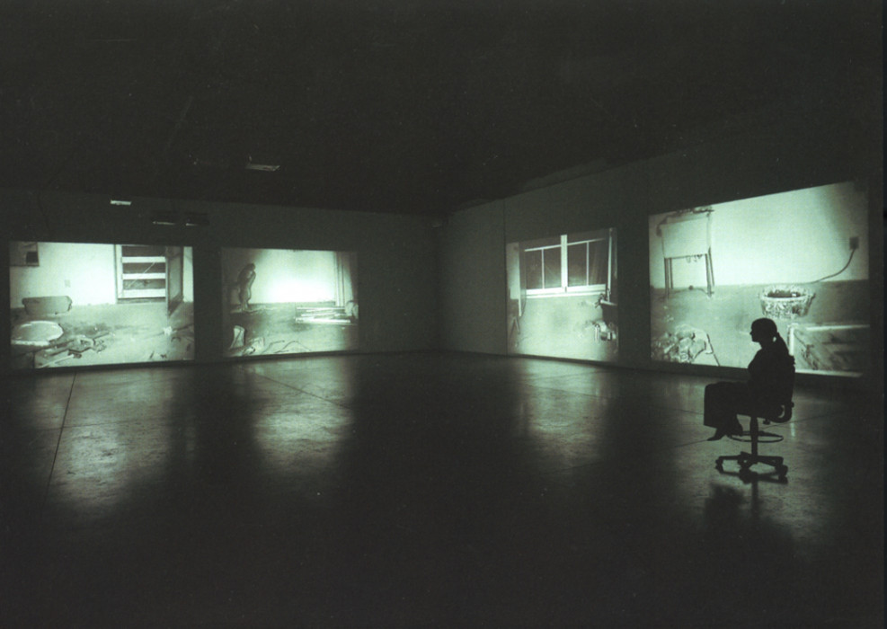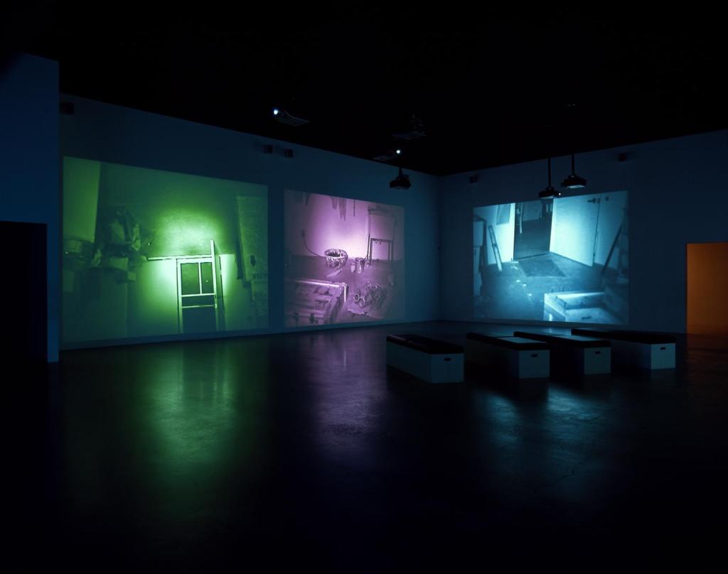 The images depict some of the video work by Nauman. The storytelling was about the cat and mice in his studio. The multiple nocturnal projections captured the mice but he also captured all the activity in the studio and the discarded materials throughout the summer of 2000.