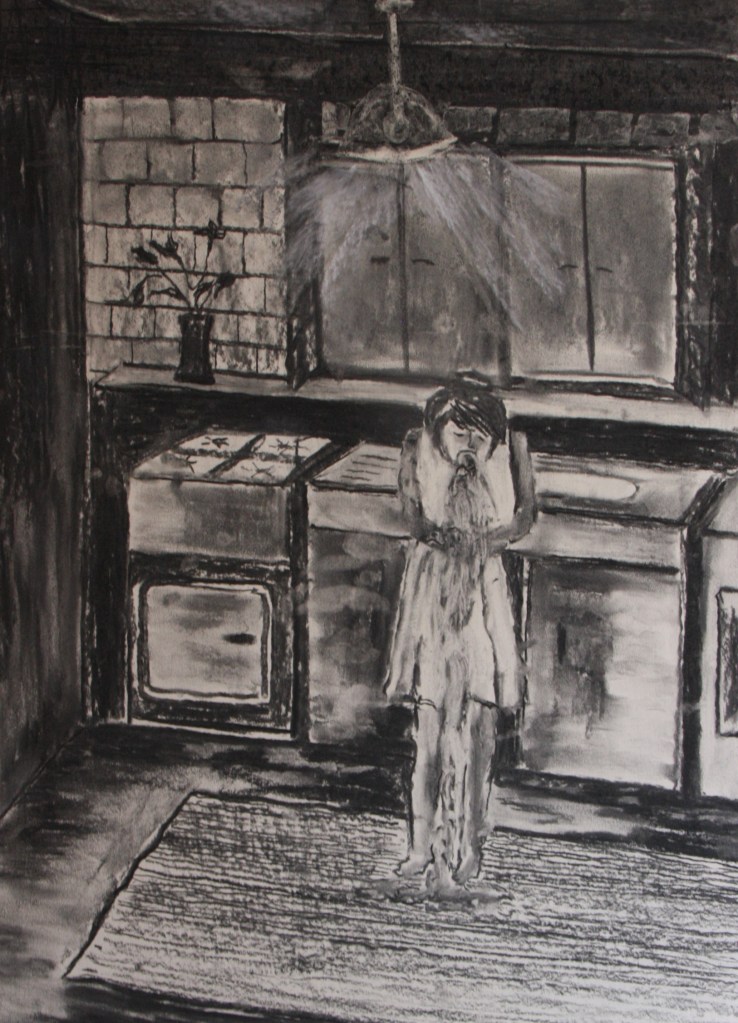 My tutor sent me details of an animation website and I have been testing out how to do animation. She thought this work might suit such a step. However I’ve been doing an animation of facial expressions and I may submit this if good enough. This drawing however did turn into something else. By chance at the top of this drawing there was more space and I did intend to slice the top off. The more I looked at the drawing the more I wanted to push it further and I decided to use the top. I began to put a ceiling into the drawing which in some ways would make it darker. Once the ceiling was in, the line wasn’t quite right so I guess this is where I’d taken it to another limit and had to adjust it. The ceiling began to look good but I wanted even more drama. We did have a pendant light in the kitchen of this house so I decided to put this in too and I risked some chalk to exude the light. Returning to this drawing was quite emotional on two fronts. The child in this picture was me when I was around the age of ten. I lived in a household where domestic violence prevailed, and one night was sick through fear of what was to happen. It’s strange that I’ve drawn the mat as a good likeness and some memories can be quite vivid. The mat was a plastic woven mat It was a bit of an emotional journey to get to the final drawing as I really didn’t want to ruin it. Although I had mixed emotions I felt also quite confident that I could bring it back and I think this stood me in good stead to push the work further. I’m far less afraid now and less timid in executing my work. Even if there was an accident and I spilled paint all over it, I believe in myself enough that I can do another one, hopefully, just as good. If the worst came to the worst I could chop the top off as I intended to do.