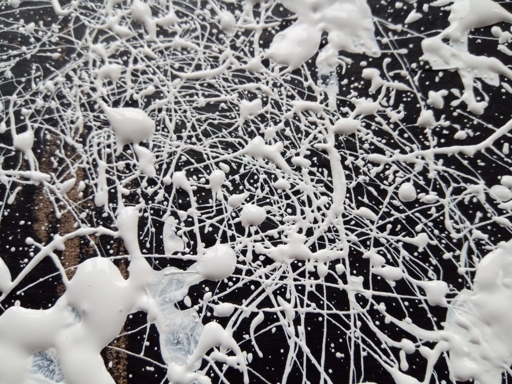 Staging chance and this process I have used before. For example in POP2 I used a mechanical hand whisk dipped in pain and I was unsure how this would go. I drenched the whisk in white emulsion paint and then turned the whisk vigorously onto my surface. I include this photo of the work which was on a black gesso piece of cardboard size approx 20 x30ins. I hadn’t any idea how it would turn out but was really pleased and exhilarated by the process and the end results…..such intricate marks.