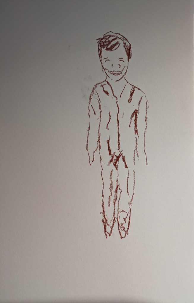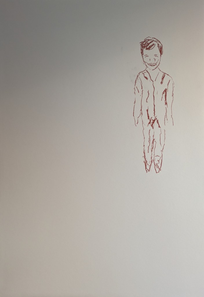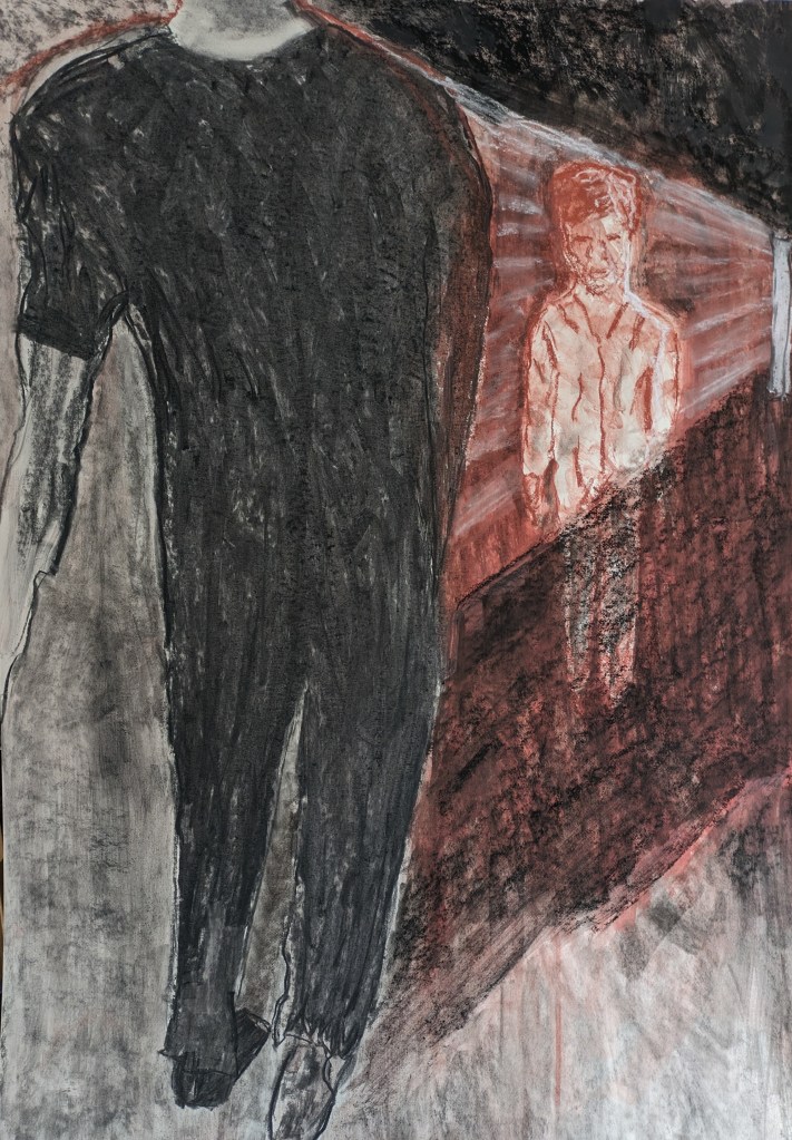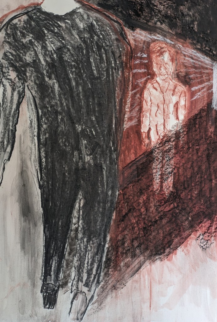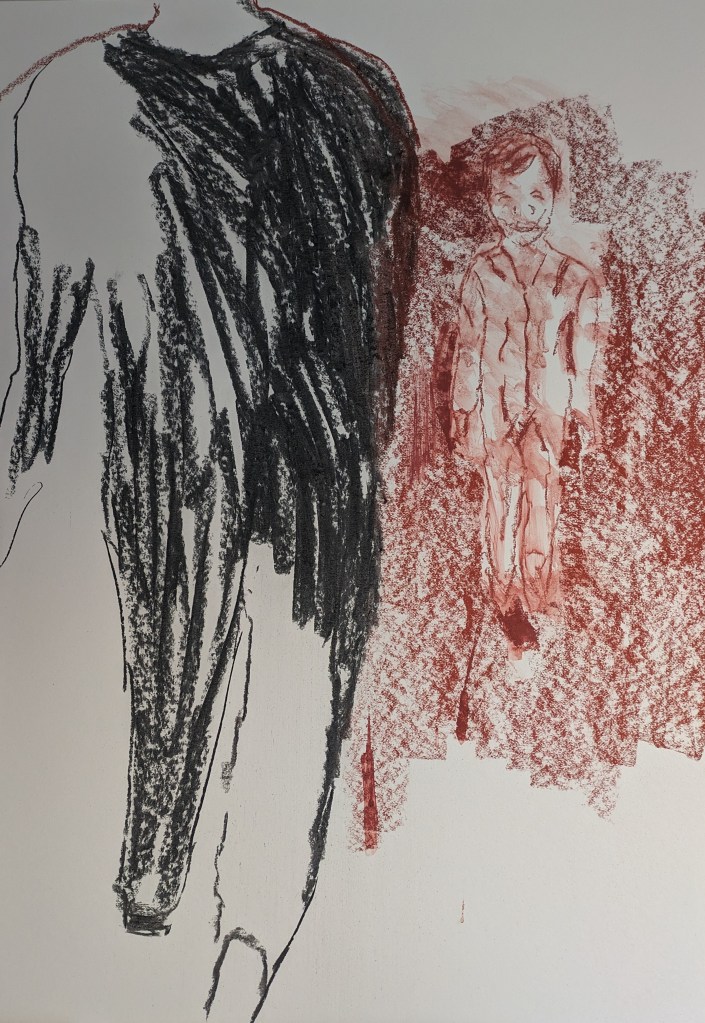 The next drawing was done with this exercise in mind. What I was trying to draw was a small child and a larger than life adult. I’m thinking of demonstrating the vulnerability of the child and the power imbalance between adult and child. I think initially because I wasn’t that keen on the exercise my heart wasn’t in the drawing. I wanted to use the technique I’ve started to employ with an outline of the figure and then blurring the lines with a wet brush. I had the idea of using two colours. The boy in indian red and the figure darker in black charcoal. I keep pushing and testing things out. My initial drawing is below in stages. I’m drawing on an A1 size white mountboard.