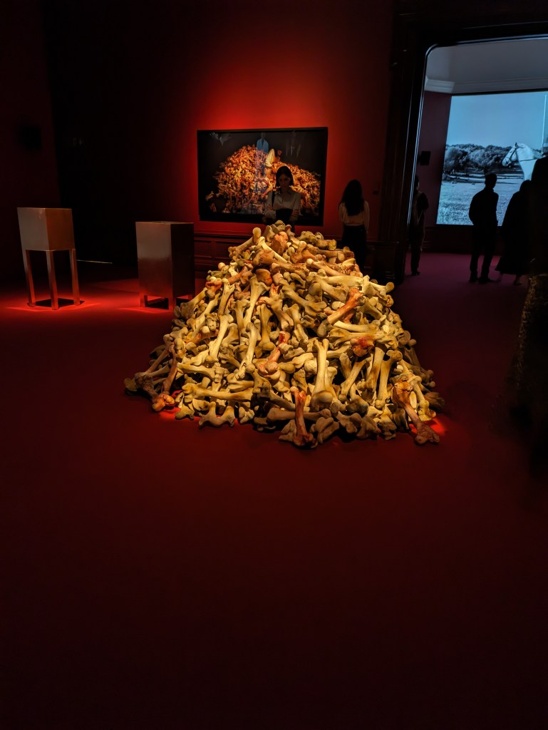 The next distasteful item was of a real naked woman lying down on an elevated platform. On top of her was a skeleton. Underneath the platform was a video of Abramovic lying in the same pose as the woman above and she also had a skeleton on top of her. While the real woman was quite still and just breathing shallowly, in contrast Abramovic was adding more movement in the video of her. She was breathing heavily and her body was quite gestural in regard to the movements with the skeleton. It seemed to me to be bordering on necrophilia. Surely this wasn’t about endurance as it definitely had sexual undertones. I researched further for more of an explanation as apart from one photo in the catalogue there was no real reference to this work. The cost of the hard cover catalogue produced by the RA was £30. I managed to find more information by googling Abramovic and nude skeleton and I found a link on the moma website. https://www.moma.org/audio/playlist/243/3132 Accessed 13/10/23
