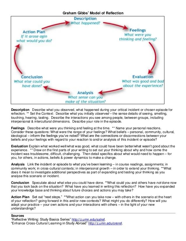 This stage required you to think about the experience. Here you will begin to actually reflect upon that experience. The emphasis is on you, your feelings and the links to your skills, knowledge and prior experience.