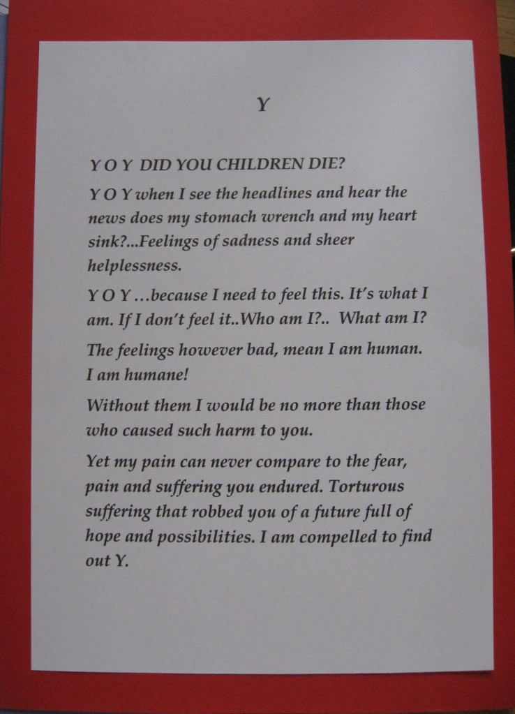 The last sentence raises a lot of questions in regard to how I implement the work and this needs to be managed sensitively. My improved competence in the charcoal drawings will be the medium that I believe will work for me and the dark earthiness of the raw material will suit the dark nature of the work. In some ways the charcoal comes from the earth as the tree that is then burnt or burnished, and there’s a correlation in regard to how the children as dust to dust also return to the earth. The text piece and the enquiries will also inform the future work as I begin to unravel what they convey.