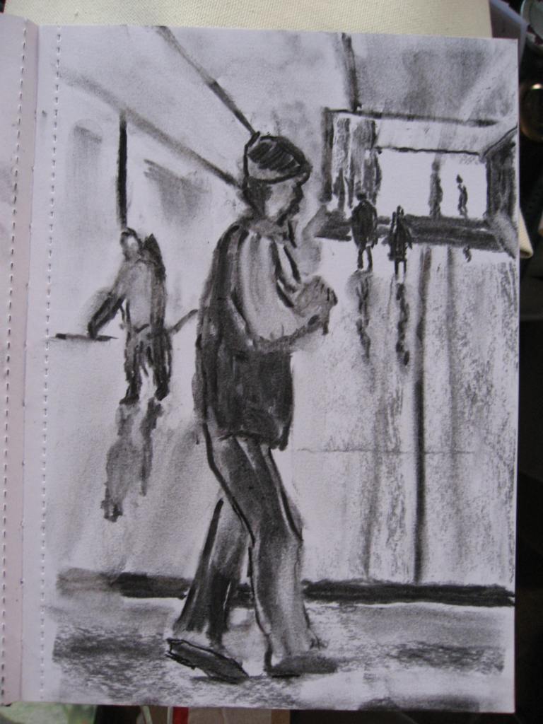 The other things I must mention about my practice is about engaging with the audience and teaching and involving them in practical ways to discover the enjoyment in drawing or painting. The workshops I held during my exhibition in June were also very successful and several people were interested in further classes. My confidence grew with the exhibition and another couple of spin offs were that I was asked to undertake a workshop with some older people at a day centre. I also undertook an interactive painting demonstration to an audience of around fifty people at a friendship club. I really didn’t know if I could pull this off but I made it fun interjecting with humour and telling them of my artistic journey. It worked well and one of the participants bought the work. I only charged for materials as it wasn’t all my work! This new found confidence has led to me responding to the open call Trinity Buoy Wharf Drawing Prize Exhibition. It was fraught getting my entries sent off. I sent three charcoal works of the allotment scenes. One was accepted and it was quite an emotional experience to see my name included of the list for the exhibition. I am quite shy by nature but in my work as a social worker I had to be at times very assertive as an advocate for children. In a similar way I guess I’m pushing myself a little on a personal level with my art. Teaching practical skills or running workshops or demonstrations can maybe be included as sustaining my practice.