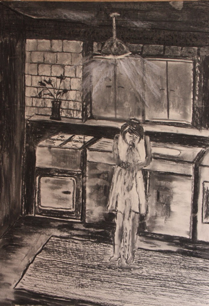 The first work is a charcoal drawing on a piece of mount board. The work is sized 24ins by 16ins. I began to explore the beauty of charcoal in Drawing 2 and I just thoroughly enjoy the processes involved in creating drawings. The charcoal is so easy to use and my drawings began to improve through its use. I usually begin by drawing outlines of figures and then put in the main light and dark shapes. I work quickly as I find this helps me to become more accurate. I don’t worry about errors as these are so easily remedied through use of an eraser. I use both hard and soft erasers plus a fine mechanical eraser for finer light lines or highlights. Sometimes the erasure marks are visible and can be intended. For example erasure marks were really good on erasing foliage in one of my previous drawings. In this drawing the erasure marks are evident on the rush mat and in the light from the ceiling. As I work I concentrate of the lights and darks such as are reflected in the planes on the face or reflections from a window. I work around the face and figure until I am happy with the tonal qualities and that the shapes are all in the right place. Once I am happy with the drawing I will use a fixative spray so that the work is sealed and won’t smudge. I have just purchased a permanent fixative. With some fixatives you can work on further and fix in stages. I intend to mount and frame this work for my exhibition. I believe the use of charcoal suits what my project is about. I don’t use any other colour and the contrasting black and white creates dramatic effects. I imagine at this stage that this work will be displayed with other similar work on my theme that show the vulnerability of children in abusive situations.