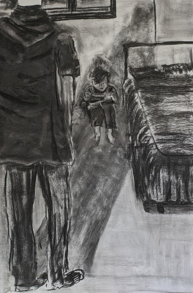 My second drawing is also in charcoal but this time I use a large 36×24 inch canvas. When I first embarked on using canvas I wasn’t sure how it would work but I had completed one before and I was able to seal it with hairspray. I now use professional fixative as I am advise through research that this can become yellow over time. This drawing is my second of this kind of nature. I created the shadows and the illusion that the boy is almost huddled in fear hiding. I hope its descriptive enough. Some might question why he’snot on the bed. This is deliberate as a lot of abuse takes place on or in a bed. Again I draw my main outlines of the drawing and then block in my main shapes. The process of erasure and redrawing is continuous until I feel I’m happy with the outcome. I plan to display this unframed and I have several other drawings of this size that I hope to display in an exhibition together.