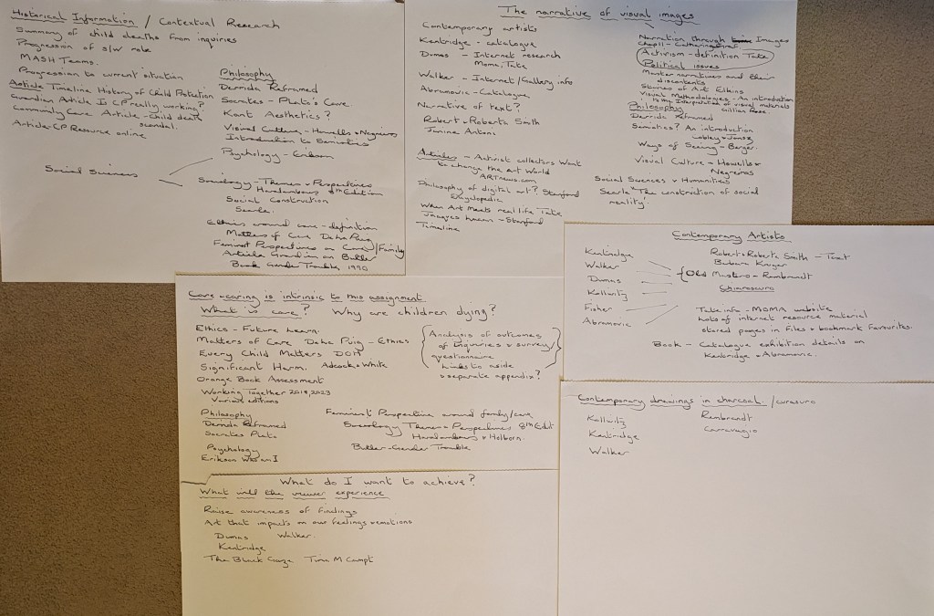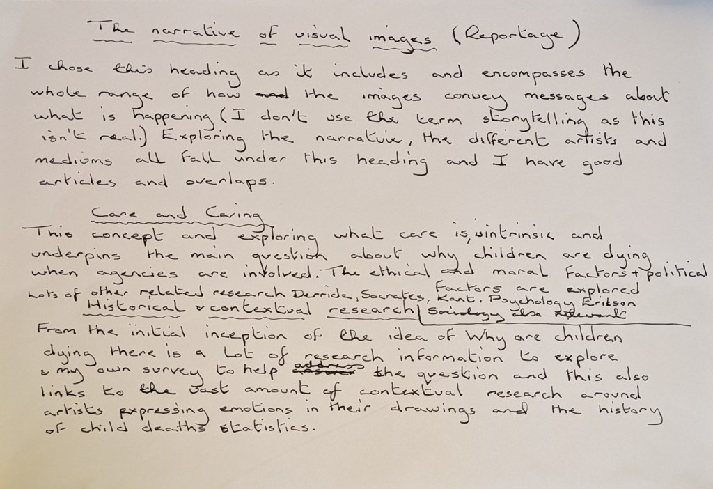 As I began I decided to use several A3 sheets from my sketchbook. I looked at the exercise and the suggested categories and selected my appropriate headings. As I began to reflect on my material and my previously drafted question I found more clarity in what I was ultimately trying to achieve and what my project and work is all about. This became clearer when I was beginning to evaluate some of my findings through reading the child care inquiry documents. The notion of care will be intrinsic to what I’m doing and I suddenly realised how this would form the basis for a lot of my arguments and analysis of findings.